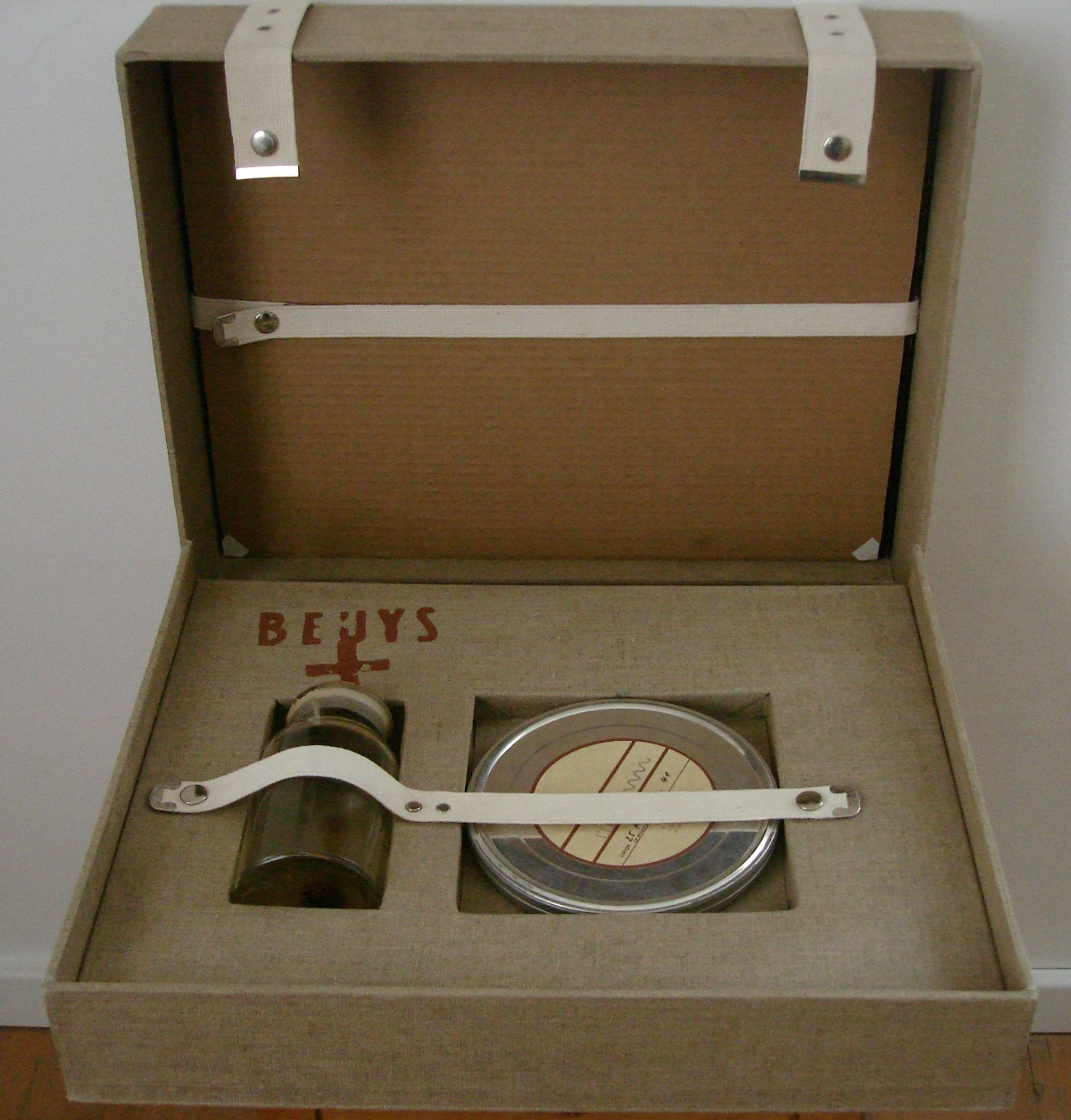 Film (Super 8), 10 Photographien, Flasche mit Gelatine, Bienenwachs, in Leinenkassette, gestempelt mit brauner Farbe (Braunkreuz)